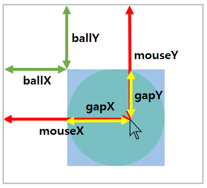 : 마우스가 이동할 때마다 마우스의 위치에서 해당 값을 빼줌으로써 ballX, ballY의 좌표를 구할 수 있음.