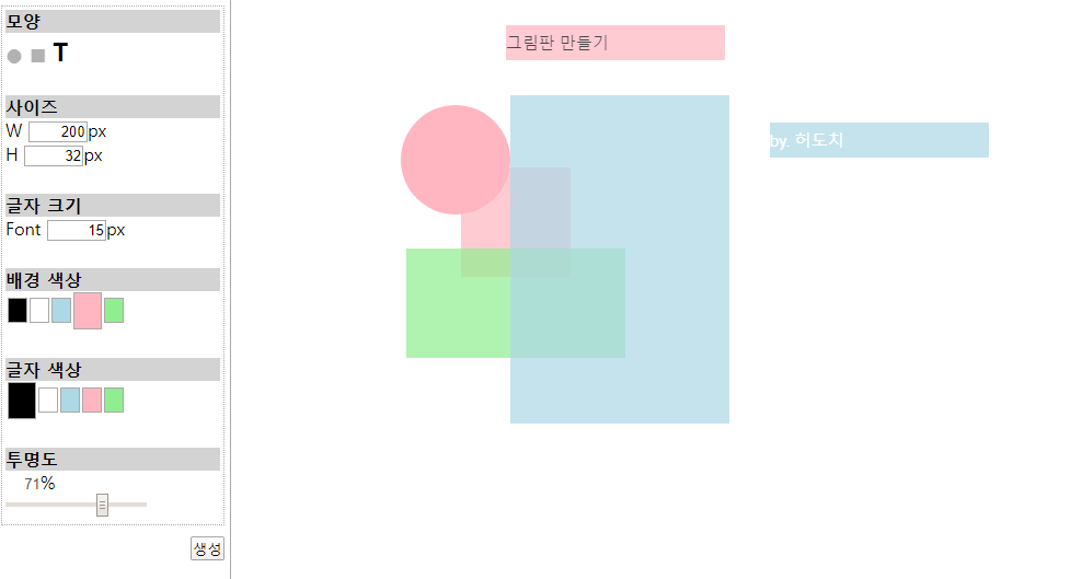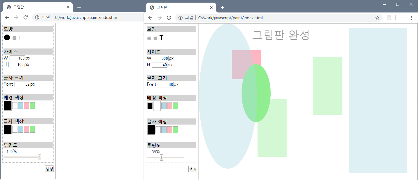어제 Javascript를 이용해서 Element를 드로그앤드롭으로 움직이는 예제를 만들었는데, 이 재밌는 기능을 다른데 활용하고 싶어졌다. 생각을 하다가 그림판을 만들어보면 좋을것 같아서 만들어보았다. 그림판이라면 선을 그을 수 있어야하지만, 이 그림판은 도형과 텍스트만 지원한다. 간단하게 만든거라 완성도는 떨어지지만 재밌는 예제라고 생각한다. 어려운 로직이 포함된 것이 간단한 설명과 함께 정리해보았다.