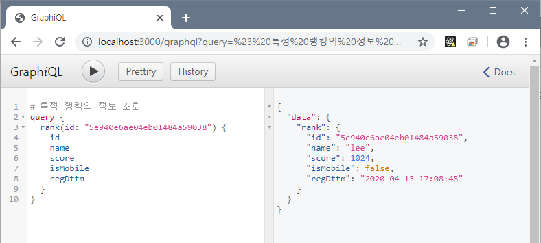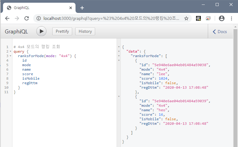 - 2048게임의 랭킹을 구현하는게 번거로워서 시작한 GraphQL인데, 오히려 새로 배워야하는게 많아서 더 번거로웠다. 하지만, 사용해보고나서 매우 만족하고 있다. 이제 3일정도 사용해봤기 때문에 이렇다할 단점을 찾지는 못하였다.