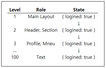 예를 들어, 메인화면에서 로그인을 했을 때, 헤더에는 유저의 정보를 보여주고, 메뉴목록에는 회원만 접근가능한 회원메뉴이 추가된다. 이 때 상태값의 흐름을 살펴보면 상위에서 하위로 계속 전달되는 것을 알 수 있다.