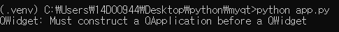 3. 만약 QtWidgets을 생성하기 전에 QtApplication을 생성하지 않으면 아래와 같은 오류가 발생.