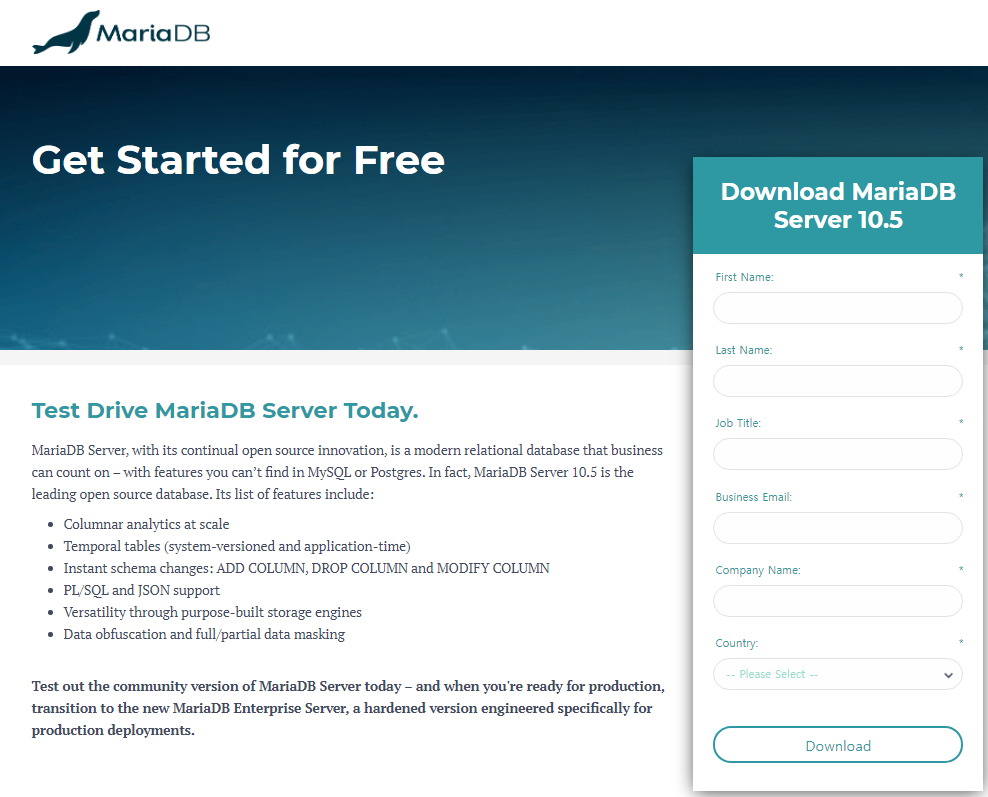 Test Drive MariaDB Server Today. MariaDB Server, with its continual open source innovation, is a modern relational database that business can count on – with features you can’t find in MySQL or Postgres. In fact, MariaDB Server 10.5 is the leading open