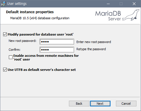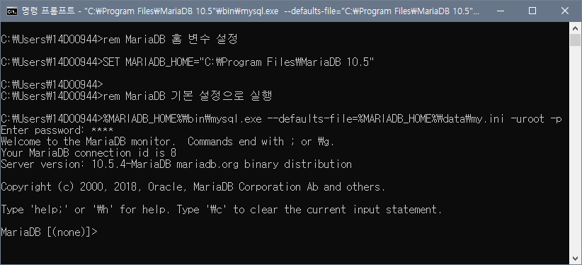 rem MariaDB 기본 설정으로 실행, root 계정