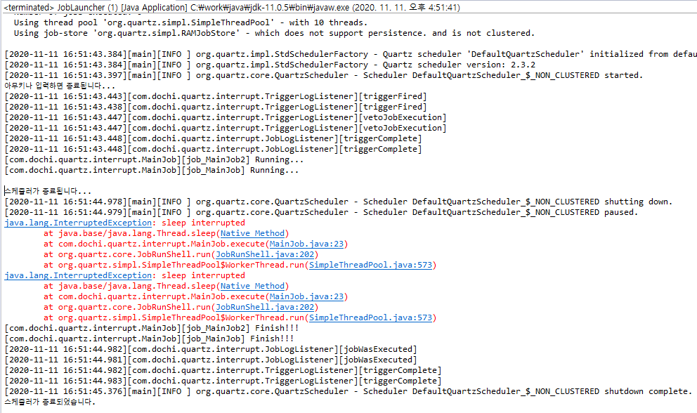 - 이미 Job이 실행중이라면 위와같이 InterInterruptedException이 발생함.