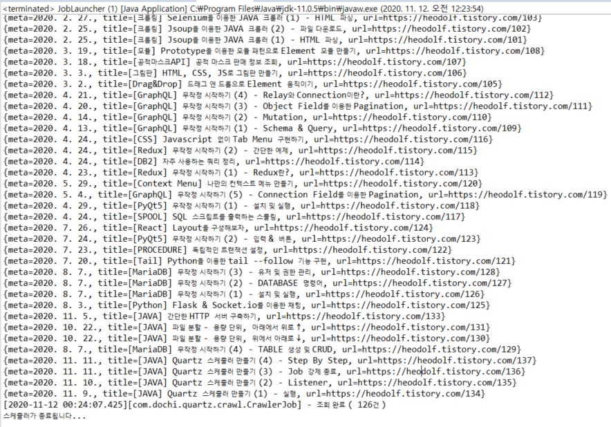 드디어 크롤러를 스케줄에 따라 자동으로 수집하도록 설정하였다. 예제는 간단하게 만드느라 단순히 글 목록을 수집하고 출력하는 기능만 구현하였지만, 실사용하려면 저장소에 데이터를 보관하고 같은 데이터를 다시 수집하지 않도록해주는 설정이 필요할 것이다.