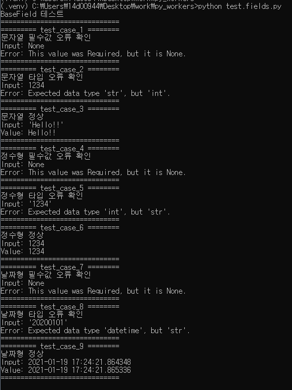 - 지금까지 BaseField 객체를 생성하고 테스트 해보았다. 다음 포스트에서는 이 BaseField를 상속받은 StringField, IntegerField, DatetimeField 객체를 생성하고 각 데이터 타입에 알맞는 유효성검사를 추가해보도록 하겠다.