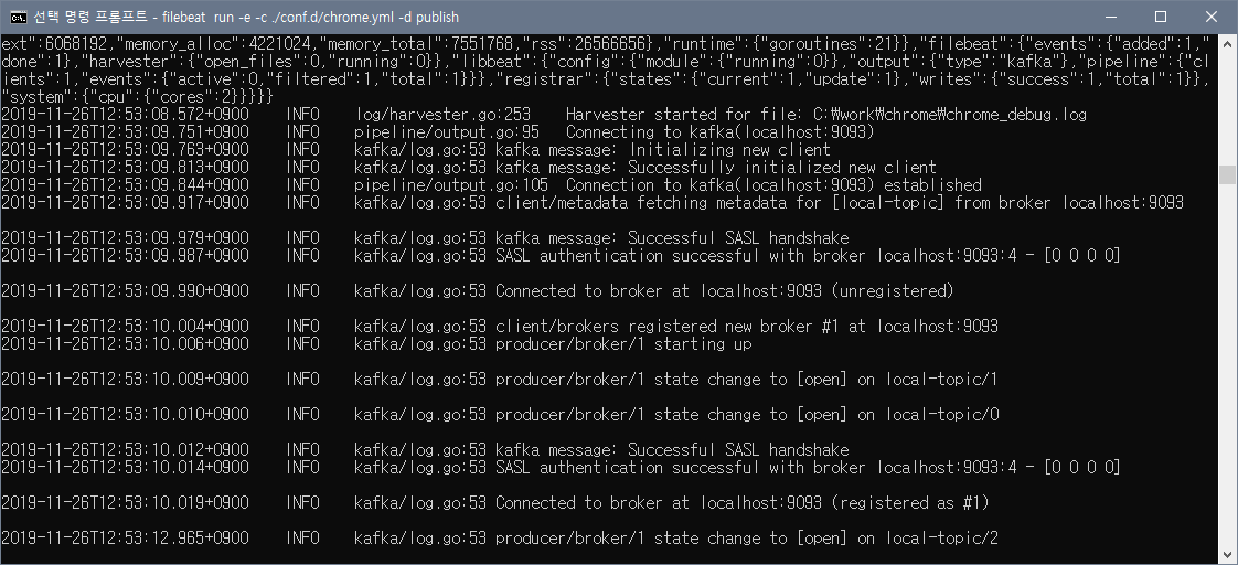 - 실행되면 Beat를 전송할 때, Kafka에 Connection 되는 모습을 확인할 수 있음.