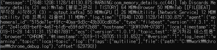 - 지금까지 Chrome Debug 로그를 Filebeat으로 수집하여 Logstash로 전송하고, Logstash에서 데이터를 가공하여 Kafka에 적재하는 프로세스를 구현하여 보았다. Consumer Client를 열어두고 Debug 모드로 실행한 Chrome에서 이리저리 돌아다니면 Consumer Client에 로그가 실시간으로 출력되는 것을 볼 수 있다. ( 약간의 지연시간은 어쩔 수 없다 )