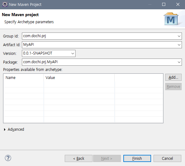 1-4. GroupId, ArtifactId 입력 후 [ Finish ] 클릭.