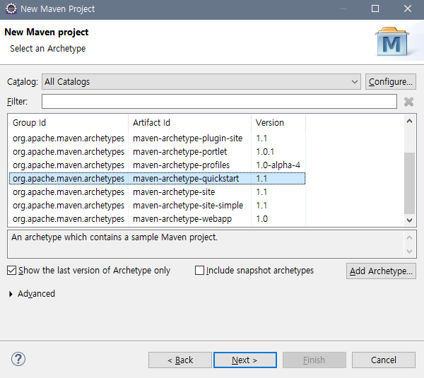 1-3. maven-archetype-quickstart 1.1버전 선택 후 [ Next ] 클릭.
