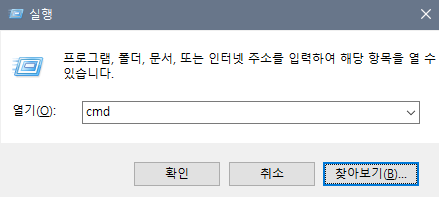 - [ 윈도우키 ]+[ R ] > [ CMD ] 입력 > 확인.