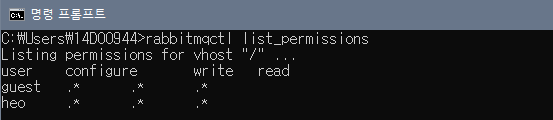 - rabbitmqctl set_permissions [-p <vhostpath>] <user> <conf> <write> <read> 실행.
