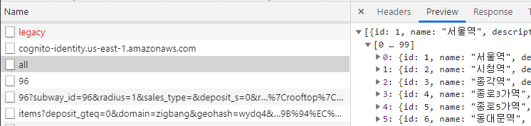 - 다른 XHR 로그들을 살펴보면 지하철역 정보들도 API 서버에서 가져오는 것을 확인할 수 있음.