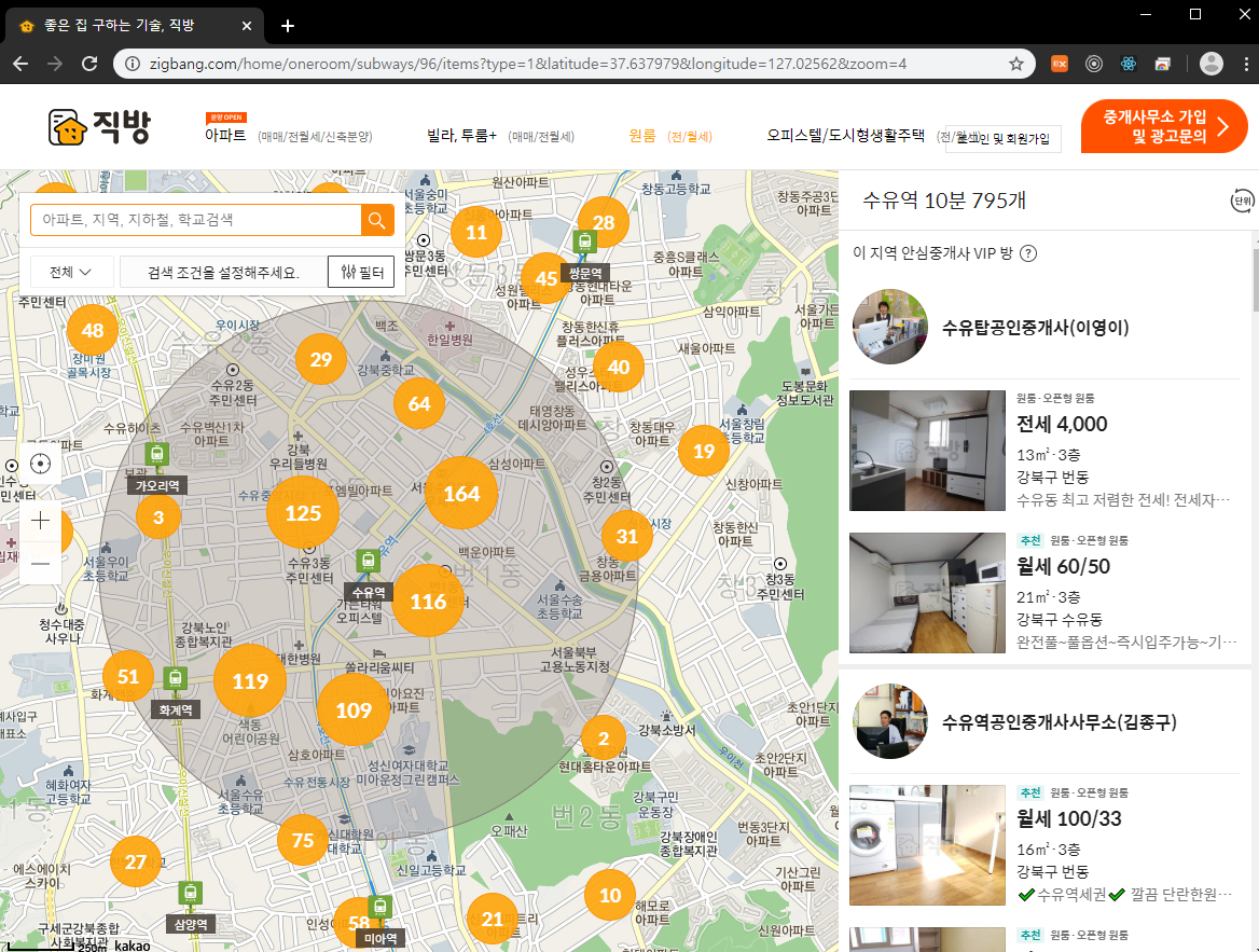 - 검색하면 위와같이 지도에 수유역을 중심으로 주변의 매물들이 조회됨.