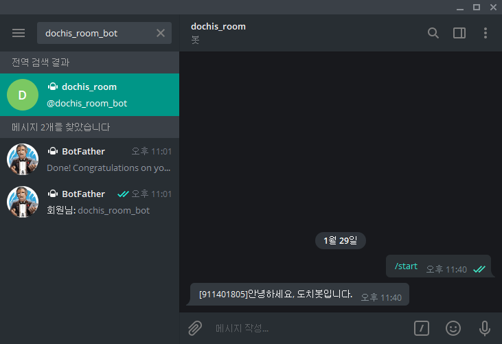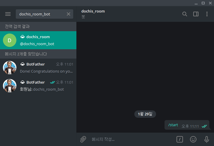 - 대화창에서 [ 시작 ] 버튼을 누르면 [ /start ] 명령어가 자동으로 전송되는 것을 확인할 수 있음.