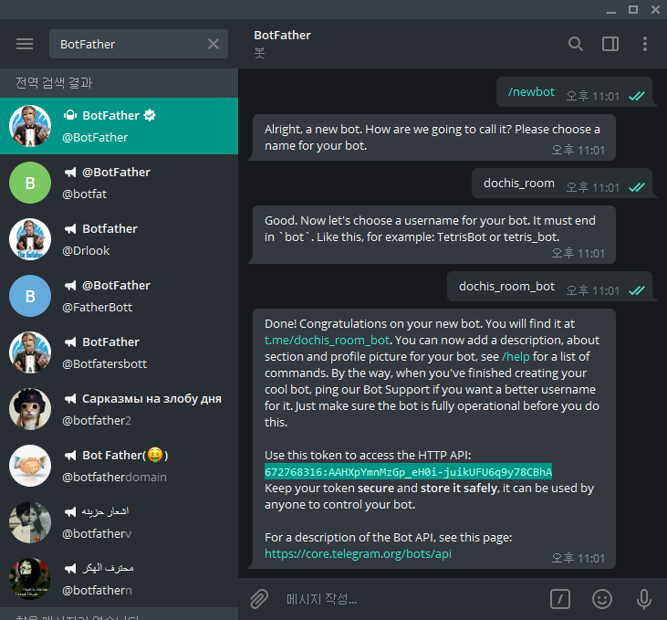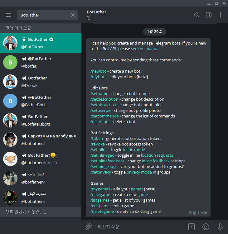 - 'BotFather'는 텔레그램에 있는 모든 봇을 관리하는 마스터 봇.