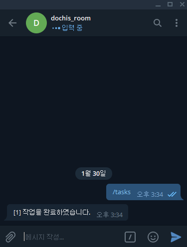 - 처리가 완료되면 '[1] 작업을 완료하였습니다.'라는 Message를 한번 더 전송.