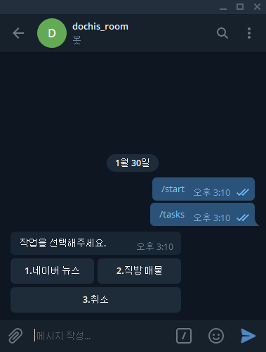 - [ /tasks ] 명령어로 받은 버튼(1.네이버뉴스)을 클릭하면 위와 같은 결과를 얻을 수 있음.