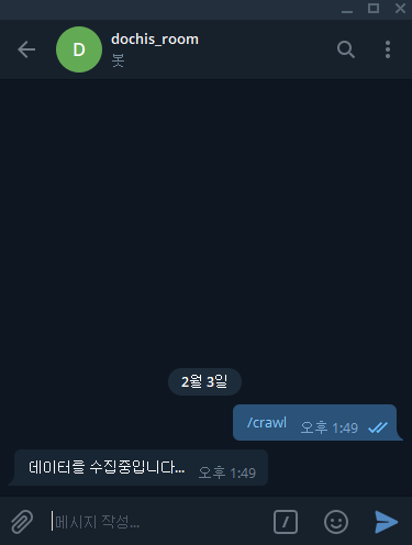- 기존에는 Crawler를 만들고나면 Flask로 웹 페이지를 만들어서 조작했었는데, 텔레그렘 봇을 알고나서부터는 거의 텔레그램 봇을 만들어서 사용하고 있다. 코딩할 것도 적고 디자인도 고민할 필요가 없어서 너무 편하다.