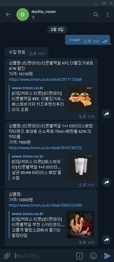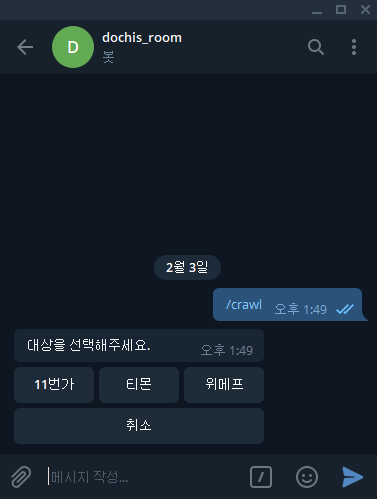 지난 포스트에서 Selenium을 이용하여 11번가, 티몬, 위메프의 특가상품을 수집하는 크롤러를 만들었다. 그러나, 데이터를 수집할 때 마다 PC에서 Crawler를 실행시켜야해서 불편하고 실용성이 떨어진다. 그래서, 텔레그램 봇을 이용하여 스마트폰에서도 데이터를 수집할 수 있도록 기능을 추가해보려고 한다.