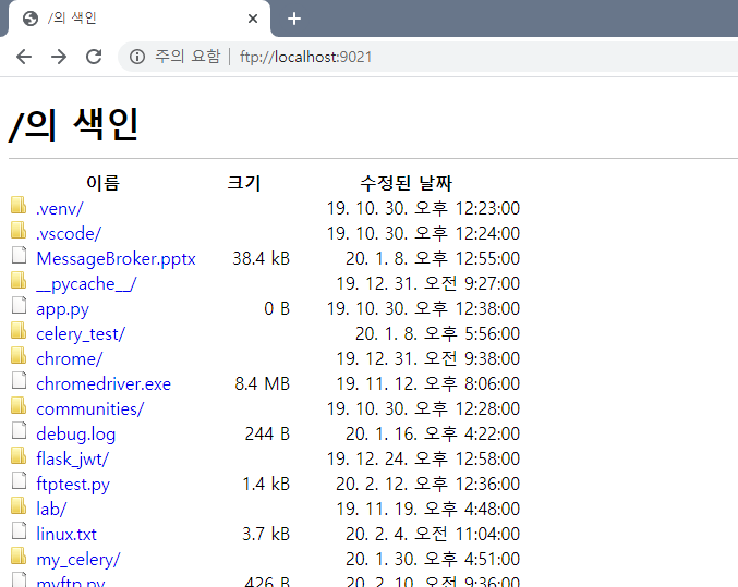 - 웹브라우저에서 [ ftp://127.0.0.1:9021 ] 또는 [ ftp://localhost:9021 ] 로 접속.