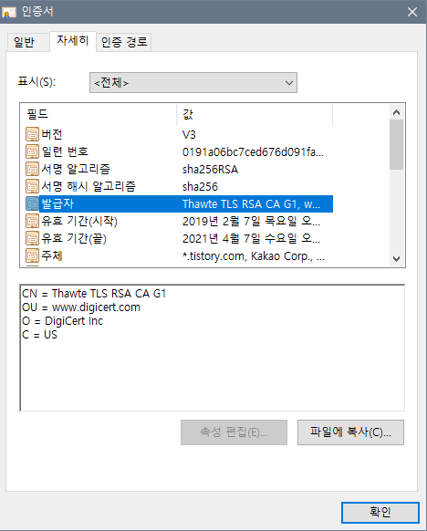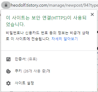 * Chrome 브라우저에서는 주소창 옆에 자물쇠 표시가 뜨는데 이를 클릭하면 인증서 정보를 확인할 수 있음.