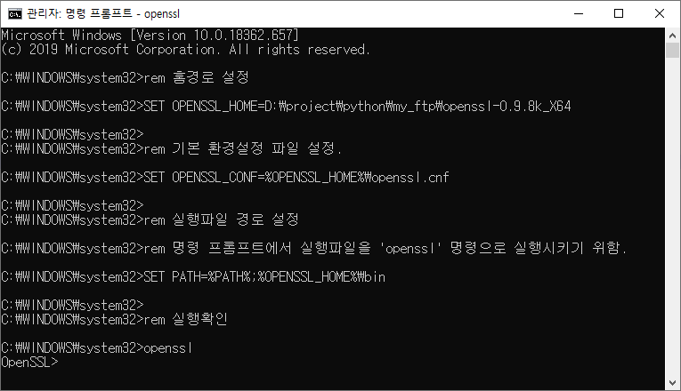 rem 명령 프롬프트에서 실행파일을 'openssl' 명령으로 실행시키기 위함.