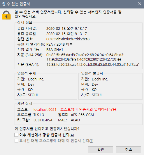 - FileZilla Client를 통해 [ ftpes://localhost:9021 ]에 접속하면 위와 같이 '인증서 검증' 알림창이 뜸.