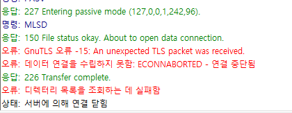 - 예제를 만들다가 중간에 다른 옵션을 추가했었는데, 그것 때문에 FileZilla에서 접속하면 [ -15: An unexpeted TLS packet was received. ] 오류가 발생했다.