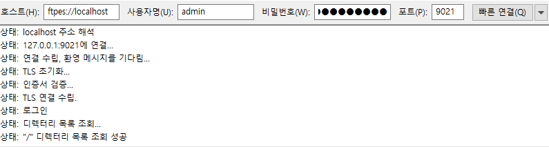 - 인증이 완료되면 'starting FTP+SSL server' 문구와 함께 FTPS 서버가 실행됨.